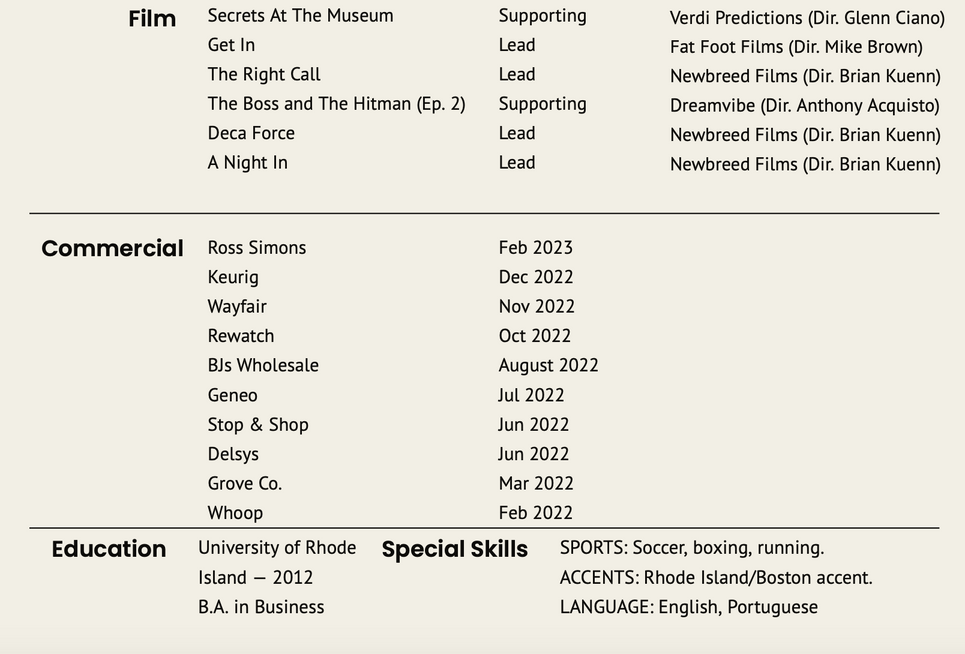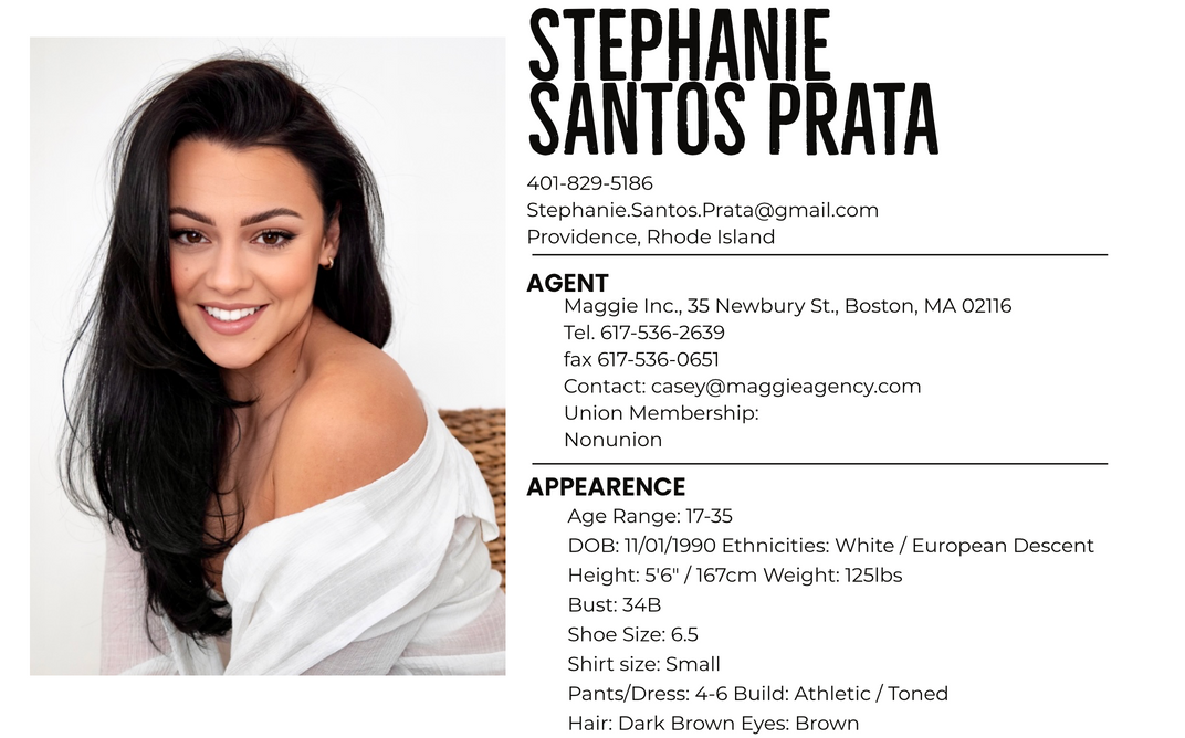 I am a 32 year old model and actress based out of Providence, RI. I have been modeling and acting for 5 years and have been represented by Maggie, Inc. for 1 year. I love acting in creative projects, especially those that allow me to play a character that everyone will remember and gain an emotion from.